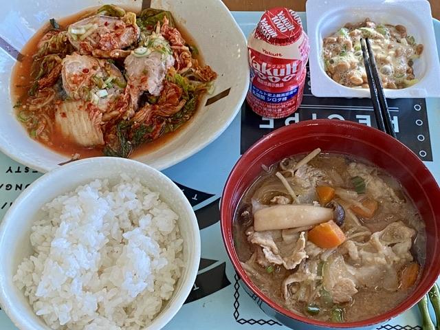 サバの水煮缶キムチ和えと納豆と野菜いっぱい減塩豚汁(●^o^●)