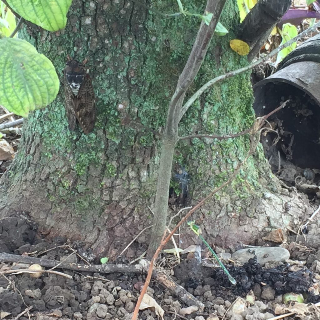 蝉がテラスでひっくり返ってたので土に返そうとしたらまだ生きてたので日陰の根元...