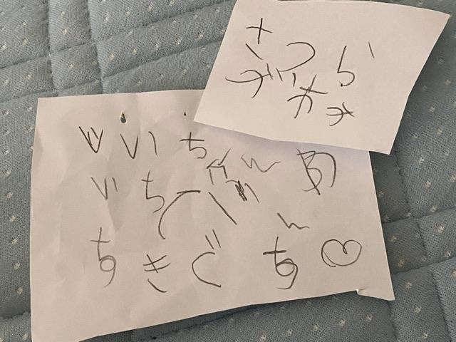 5歳が書く文字。 丸がひっくり返る感じとか、かわいいなぁ。 自分ではちゃんと読...