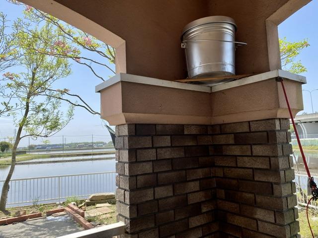 焚き火バケツ。ふだんは邪魔なのでここを置き場にしている。 こんばん焚き火やるべ...