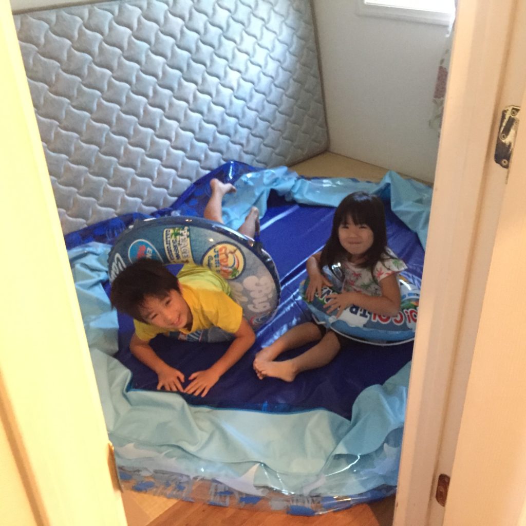 天気が悪かったので客間(3畳)に干しといたプール。こどもらは室内プールだって遊ん...