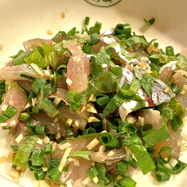 青紫蘇の葉っぱと小ネギと生姜のみじん切り。