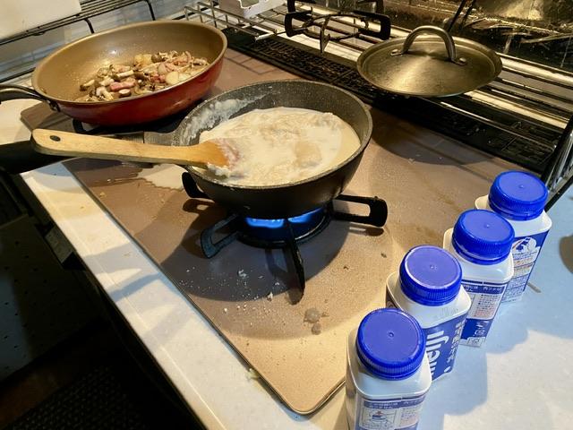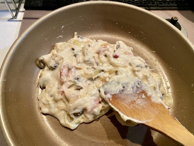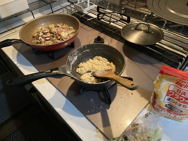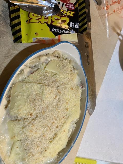 2025-12-5 うどん粉。 料理 はらぺこで帰宅した夜。 寒くて暖かいもんが食べたくてバター溶かして小麦粉を炒める。 牛乳1本くらいで1人前をつくりたいのに、 いくら牛乳たしてもグリングリンに固まっちゃう。 素人はちゃんと計り使わないと大変なことになるんだな。 ほぼお好み焼きの固さ。フライパンあおってひっくり返せる。 う~ん、なんだか不安。この4倍のホワイトソース(固形状)が残った。 完成。 クリームシチュー焼きというか、うどん粉ベドベドグラタン。 用法・用量はきちんと調べて計るようにしよう。 きょうのジンは「六」だよ。 新しい記事へ 古い記事へ