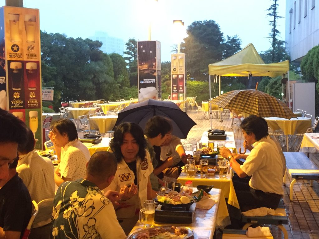 ビヤガーデンで組合の暑気払い! 大雨が屋根下に吹き込み バスタオルで拭きながら...
