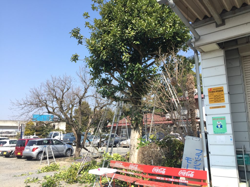 近所のおっちゃんが剪定してくれた。 上の写真の黄色い看板の左に スズメバチの巣...
