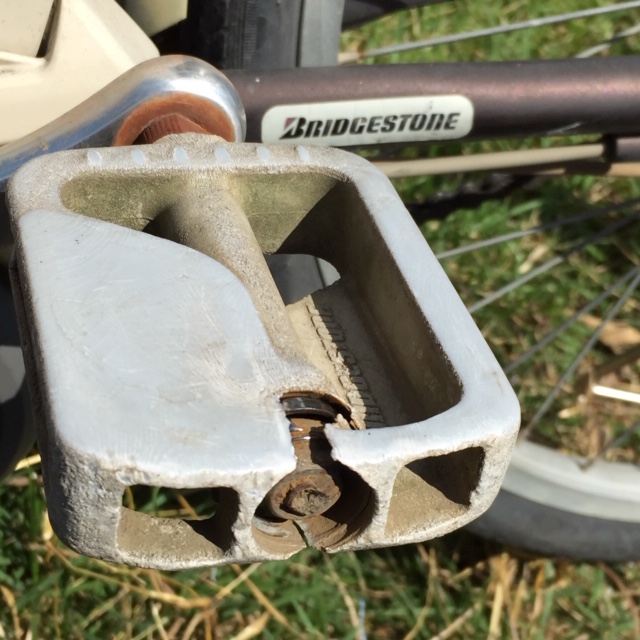 自転車こいでて、キーコキーコなんだか変な音すると思ってたら、 ペダルがすりきれ...