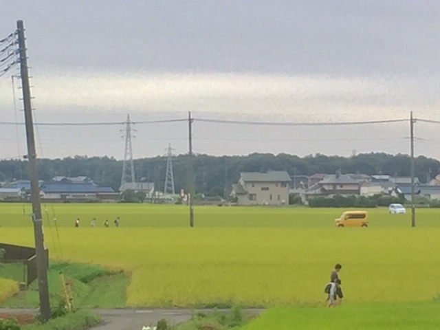 刈り取り直前の畦道を息子と孫が歩ってる。 左の電信柱かたむいてるけど、だいじょ...