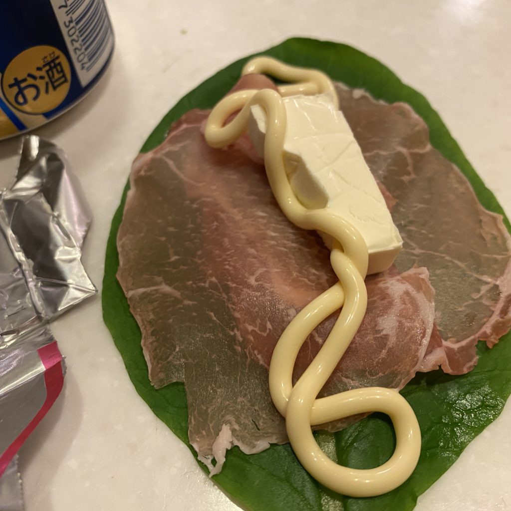 生ハムチーズマヨネーズ…が虫みたい(°▽°) 小松菜で巻いて酒肴にした。 生ハムは1年...