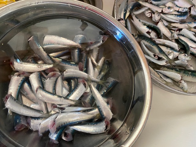 興にのり、イワシ・イワシ・イワシ。 塩水で洗ったあと、新しい塩水に1時間漬けた...