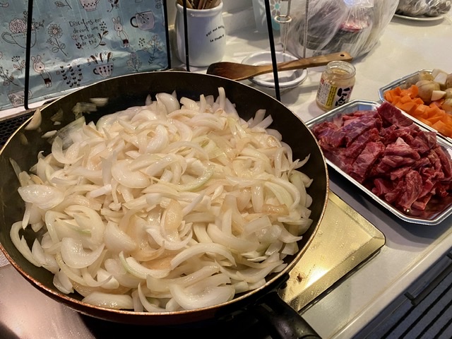 玉ネギ6個。規定量に2個増し。 ニンジン2本とジャガイモ4個。 水を少なめ。 ザ・カ...