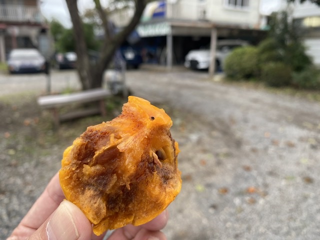 なってる柿はまだ半分青いけど、 落ちてるのにはもうこがふいて美味しいのもあった...