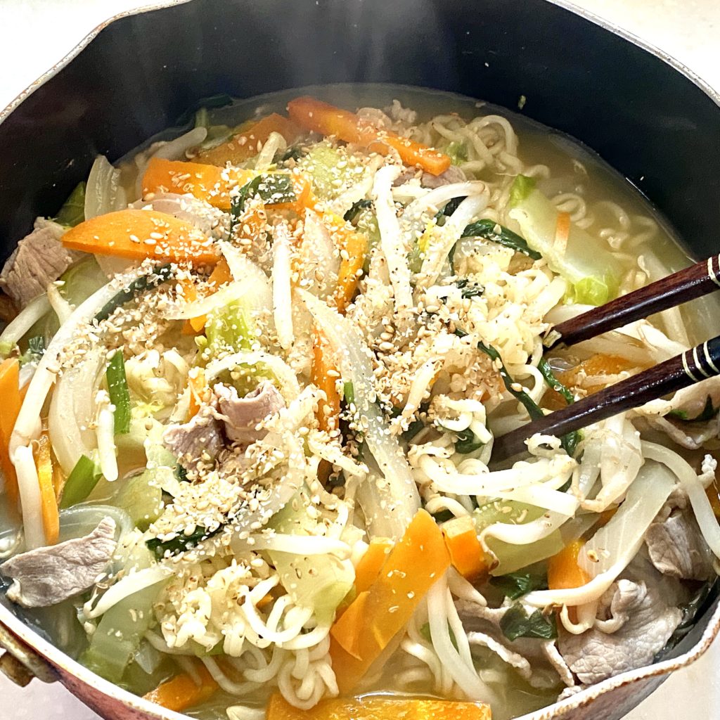 好物のサッポロ一番塩ラーメン。 セロリ、ニンジン、タマネギ、ニラ、モヤシ、白菜...