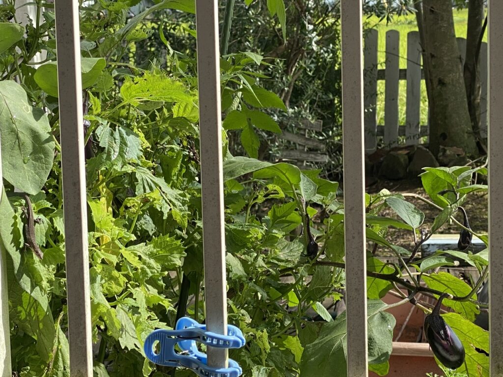 夏休みに孫たちが鉢でナスをつくってる。 左端の葉っぱになんかたかってる。 あぁ...