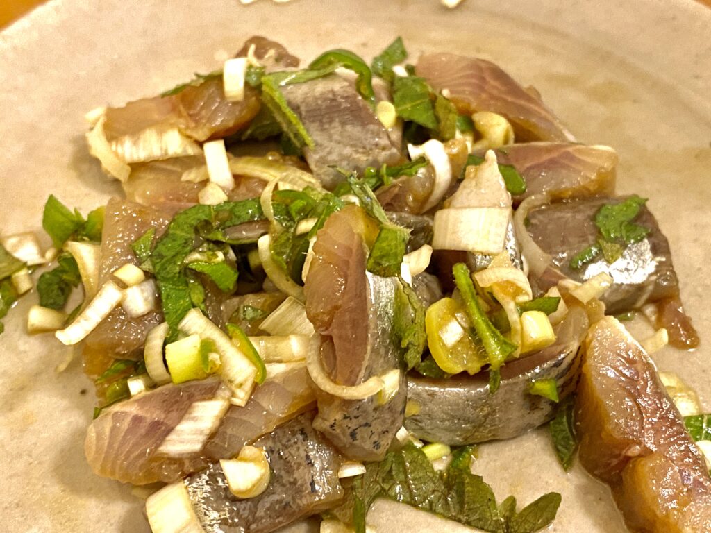 イワシの薬味は 孫が鉢で育てた大葉と青トウガラシ。 青ジソは虫にも大人気らしく ...