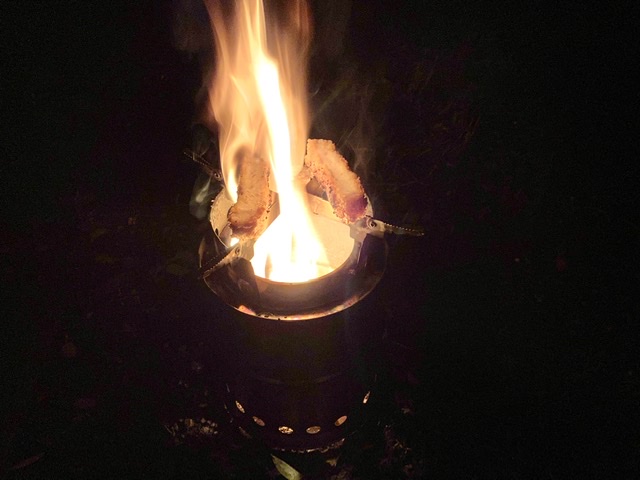 夜8時。飲みに行こうと思ったけど スーパーでトンカツとレモンサワー買って 焚き火...