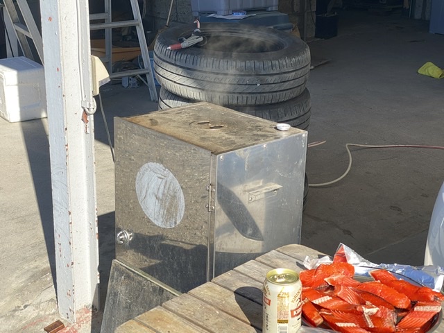 ちょっと風が強いけど、風裏でゆっくりケムリ番。 最初にお刺身用のトラウトサーモ...
