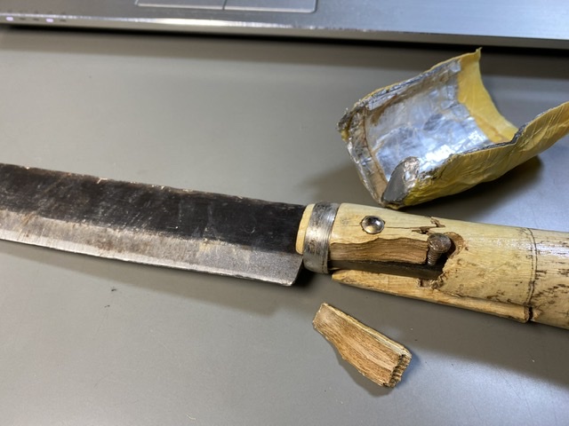 廉価の小鉈。 買ってすぐに割れちゃったのでアルミテープでグルグル巻いて数年使用...