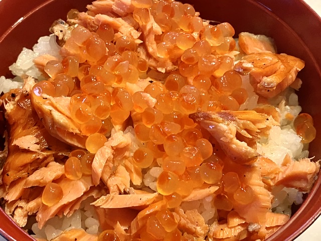 シャケとイクラで親子丼。 実は偽親子。 おもしろいねー、「ほぼいくら」。 ほぼソ...