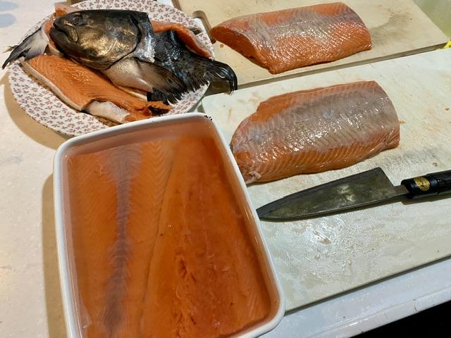 しっぽのほうは塩水につけておいて、後日燻製つくるよ。