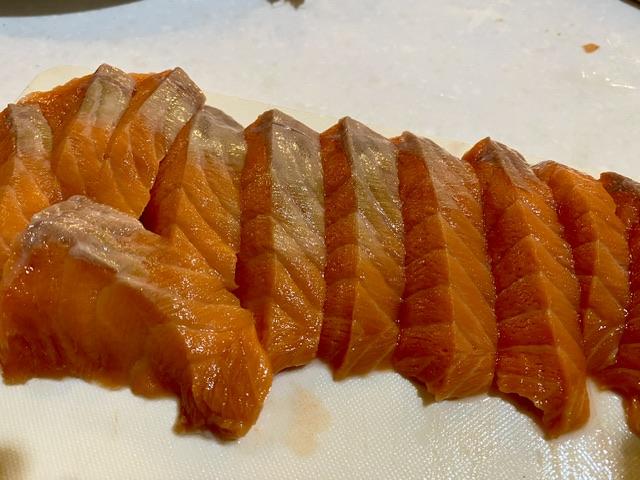 フィレの一部はお刺身にする。けど、スポンジっぽくてたまげるほどうまいわけじゃない。