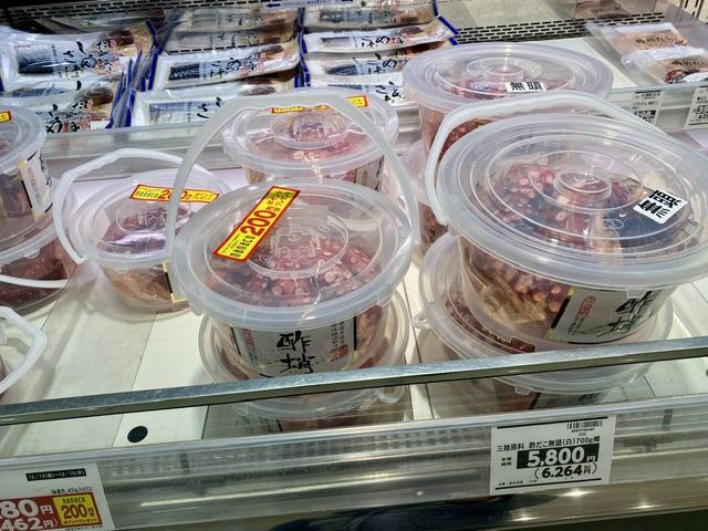 スーパーには賞味期限1ヵ月を超す酢だこが並びだした。